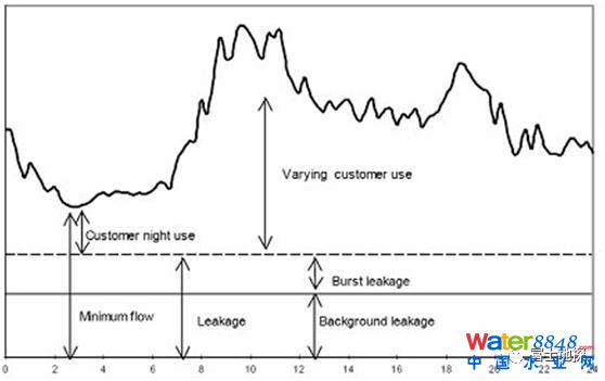 通過翻譯文中內容,我們可以知道背景漏失,是一套供水管網系統(tǒng)中所有相對小型漏點的累計漏失量。這些漏點來自于閥門、接口、消火栓、水表、水龍頭、馬桶水箱、樓頂水箱等。這些漏點從探測的經濟性和維修價值上講都是無效的,因此行業(yè)普遍接受這種事實存在所有供水管網中的漏點類型。一般背景漏失還可進一步分為三個部分: