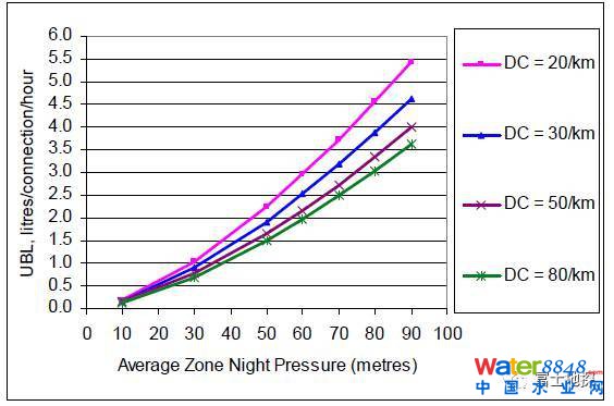 該公式所要表達的最重要一點就是背景漏失水量在N1系數不同的變化下,與壓力值是成一定正相關的關系。如圖1, 我們可以看到壓力越高,其背景漏失量就越高。