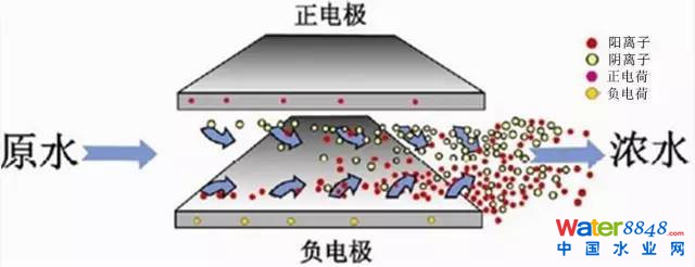 水處理中,水中的鹽大多是以陰陽離子(或稱正負離子)的形式存在。所謂“電化學(xué)中的雙電層理論”,就相當(dāng)于在水中安裝一個平板電容,通過施加外加電壓形成靜電場,兩個電極板分別帶正負電荷,強制離子向帶有相反電荷的電極板上移動,陰離子向正極板移動并聚集,陽離子向負極板移動并聚集,這樣使水體本身鹽度降低,實現(xiàn)了除鹽的效果。