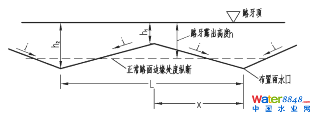 設置鋸齒形偏溝,雖然能夠保證縱向排水的要求,但施工比較麻煩,影響道路的美觀,且在偏溝寬度范圍內不利于車輛的平穩(wěn)行駛,目前設計已較少采用。