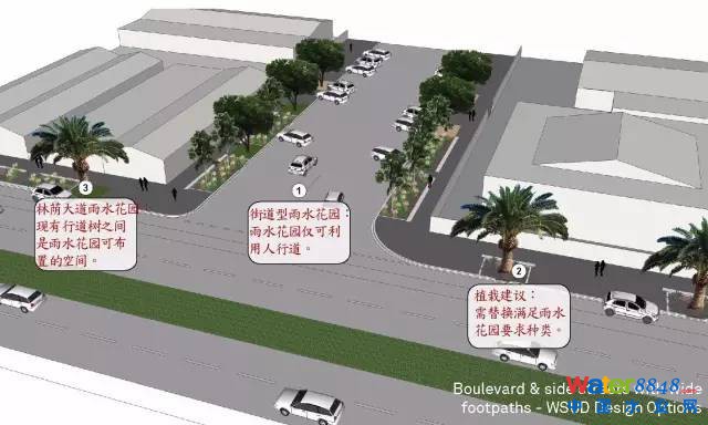 利用寬闊的人行道構(gòu)建雨水花園系統(tǒng),緩解該街道缺乏植栽及洪水問題,并提供雨水處理。