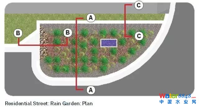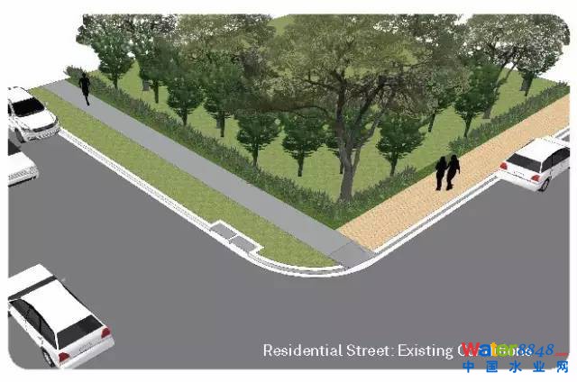在街道一側(cè)增加雨水花園,并與原有街角綠化帶相溝通