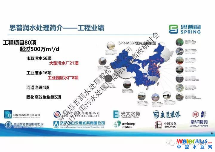 最后介紹一下我們公司,我們是2006年成立,注冊資金6900萬,新三板高新技術(shù)企業(yè)。專注MBBR的建設(shè)。工程業(yè)績現(xiàn)在是近500萬噸每天,思普潤從成立開始跟MBBR結(jié)下不解之緣,專注11年。我們很早時就采用水質(zhì)保障協(xié)議方式保證業(yè)主利益,就是說不達(dá)標(biāo)可以不給我們錢,甚至我們體量達(dá)到三百萬噸時,公司都因?yàn)槲覀兊膮f(xié)議保證而在墊資建設(shè),這也是源于我們對自己工藝的信心。我們擁有完整的自主知識產(chǎn)權(quán),發(fā)明專利,獲取國家省市的眾多獎項(xiàng)。我們李村河獲得水協(xié)張杰院士的審評,參與國家865的專項(xiàng)課題技術(shù)發(fā)展。今天就介紹到這里,謝謝大家。