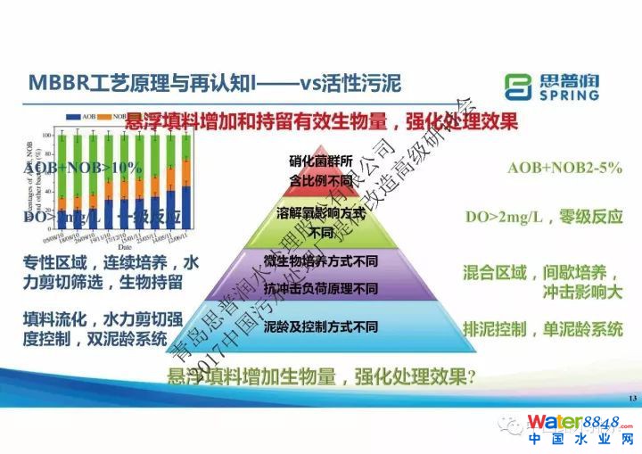 第二個是介紹MBBR的工藝原理與再認(rèn)知。我們一想到生化工藝,最初想到的就是活性污泥法,此技術(shù)已經(jīng)發(fā)展百年,所以我們總習(xí)慣拿活性污泥法跟MBBR工藝作比較。實(shí)際它跟活性污泥法有聯(lián)系也有區(qū)別。首先說聯(lián)系方面,它們的動力來源相同,好氧階段都是通過爆氣實(shí)現(xiàn),MBBR技術(shù)的泥膜負(fù)荷工藝有污泥回流,運(yùn)行方式、工藝布置流程相似。再說區(qū)別方面,傳統(tǒng)活性污泥法由于通過剩余污泥排放控制泥齡,是一個單泥齡系統(tǒng);MBBR工藝是一個雙泥齡的系統(tǒng),有固定態(tài)泥齡也有懸浮態(tài)泥齡,一定程度可以緩解脫氮除磷泥齡上面矛盾。傳統(tǒng)的活性污泥法微生物是階段培養(yǎng),比如硝化菌群在好氧曝氣階段實(shí)現(xiàn)增殖恢復(fù),在缺氧段又受到抑制;而MBBR是一個專性和連續(xù)的培養(yǎng)過程,生物膜在固定區(qū)域流化培養(yǎng)。MBBR工藝中的微生物固定在填料上,強(qiáng)沖擊來臨時,整個的菌群系統(tǒng)不受影響,沖擊過后整個系統(tǒng)的效能能很快恢復(fù)。再一個就是溶解氧不同,傳統(tǒng)的活性污泥法在溶解氧大于2毫克/L時硝化功能就不受溶解氧影響,此時是一個零級反應(yīng);而MBBR工藝可以看到隨著溶解氧的增加有兩個明顯區(qū)域,不同溶解氧水平下不光有零級反應(yīng),也有一級反應(yīng)的區(qū)間。綜上所述我們認(rèn)為懸浮填料MBBR工藝泥齡控制方式和活性污泥法不同,抗沖擊原理不同,微生物培養(yǎng)方式不同,溶解氧傳質(zhì)的方式不同,硝化菌群所含的比例不同,硝化菌群比例一般大于10%,最多可以超過70%。所以我們認(rèn)為懸浮填料是增加和持留有效生物量、強(qiáng)化處理效果,而不僅僅是認(rèn)為就是增加了MLSS。