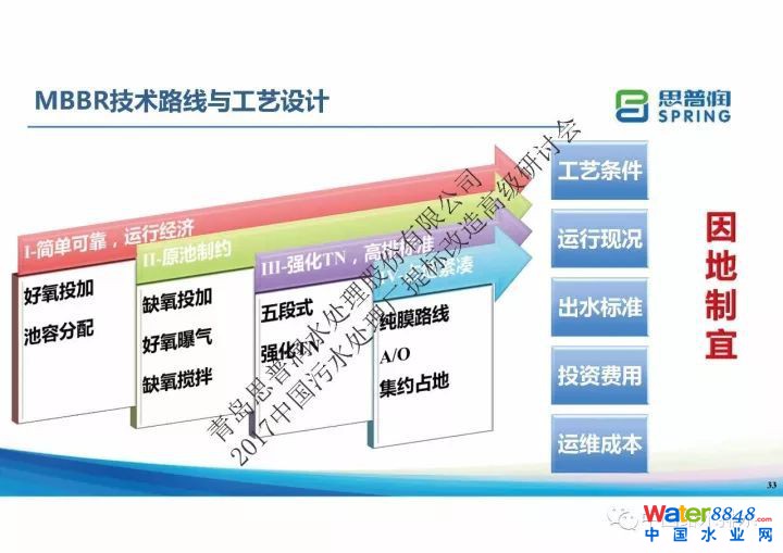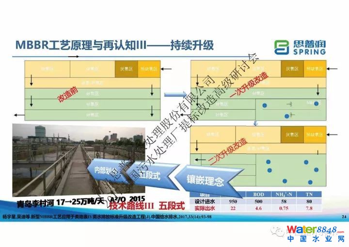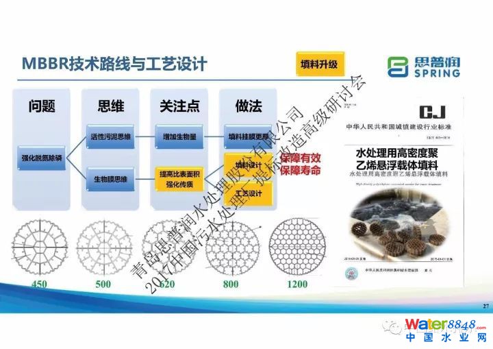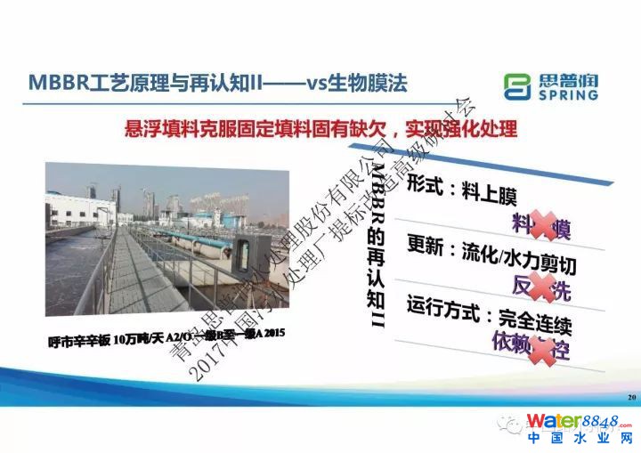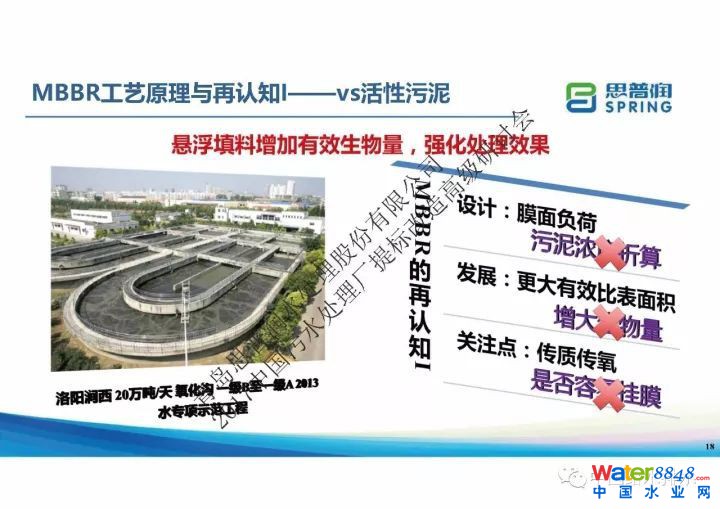 第二個(gè)是介紹MBBR的工藝原理與再認(rèn)知。我們一想到生化工藝,最初想到的就是活性污泥法,此技術(shù)已經(jīng)發(fā)展百年,所以我們總習(xí)慣拿活性污泥法跟MBBR工藝作比較。實(shí)際它跟活性污泥法有聯(lián)系也有區(qū)別。首先說(shuō)聯(lián)系方面,它們的動(dòng)力來(lái)源相同,好氧階段都是通過(guò)爆氣實(shí)現(xiàn),MBBR技術(shù)的泥膜負(fù)荷工藝有污泥回流,運(yùn)行方式、工藝布置流程相似。再說(shuō)區(qū)別方面,傳統(tǒng)活性污泥法由于通過(guò)剩余污泥排放控制泥齡,是一個(gè)單泥齡系統(tǒng);MBBR工藝是一個(gè)雙泥齡的系統(tǒng),有固定態(tài)泥齡也有懸浮態(tài)泥齡,一定程度可以緩解脫氮除磷泥齡上面矛盾。傳統(tǒng)的活性污泥法微生物是階段培養(yǎng),比如硝化菌群在好氧曝氣階段實(shí)現(xiàn)增殖恢復(fù),在缺氧段又受到抑制;而MBBR是一個(gè)專(zhuān)性和連續(xù)的培養(yǎng)過(guò)程,生物膜在固定區(qū)域流化培養(yǎng)。MBBR工藝中的微生物固定在填料上,強(qiáng)沖擊來(lái)臨時(shí),整個(gè)的菌群系統(tǒng)不受影響,沖擊過(guò)后整個(gè)系統(tǒng)的效能能很快恢復(fù)。再一個(gè)就是溶解氧不同,傳統(tǒng)的活性污泥法在溶解氧大于2毫克/L時(shí)硝化功能就不受溶解氧影響,此時(shí)是一個(gè)零級(jí)反應(yīng);而MBBR工藝可以看到隨著溶解氧的增加有兩個(gè)明顯區(qū)域,不同溶解氧水平下不光有零級(jí)反應(yīng),也有一級(jí)反應(yīng)的區(qū)間。綜上所述我們認(rèn)為懸浮填料MBBR工藝泥齡控制方式和活性污泥法不同,抗沖擊原理不同,微生物培養(yǎng)方式不同,溶解氧傳質(zhì)的方式不同,硝化菌群所含的比例不同,硝化菌群比例一般大于10%,最多可以超過(guò)70%。所以我們認(rèn)為懸浮填料是增加和持留有效生物量、強(qiáng)化處理效果,而不僅僅是認(rèn)為就是增加了MLSS。