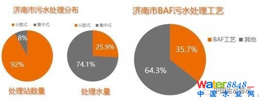 第二個(gè)部分介紹分散式污水處理的特點(diǎn)。集中式分散式兩種。分散式是集中式并行污水處理方式,是集中式污水處理有效補(bǔ)充。截止2015年底,濟(jì)南市規(guī)劃范圍內(nèi)現(xiàn)狀有政府管理的12座大型污水集中處理廠,合計(jì)設(shè)計(jì)規(guī)模為96.5萬m3/d,實(shí)際處理量為92.2萬m3/d;同時(shí)建成分散式污水處理站140余座,設(shè)計(jì)處理總規(guī)模25萬m3/d,其中由政府建設(shè)管理的有14座,合計(jì)設(shè)計(jì)規(guī)模為11.5萬m3/d,實(shí)際處理量為10.8萬m3/d。政府管理之外的那些由開發(fā)商管理。我們做了兩個(gè)圖,一個(gè)是數(shù)量統(tǒng)計(jì),一個(gè)是水量統(tǒng)計(jì),集中式8%數(shù)量處理了74.1%水量,分散式92%數(shù)量處理了25.9%水量。