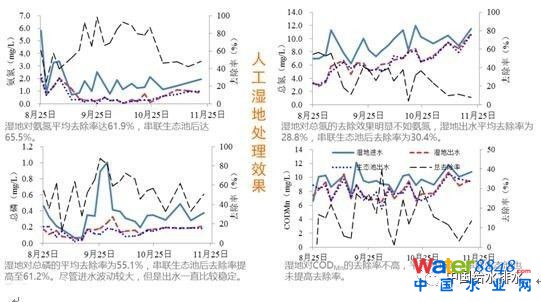 第二方面是強(qiáng)化生化處理。有效控制曝氣。調(diào)整曝氣管道開孔孔徑、布置形式并加強(qiáng)監(jiān)控,增加曝氣均勻性,提高曝氣量,調(diào)整曝氣強(qiáng)度;清理濾池時(shí)通過觀察濾料、濾頭和濾板,發(fā)現(xiàn)存在死水區(qū)及反沖洗空白區(qū),反沖洗水沖洗不到。我們?cè)诟脑煸O(shè)計(jì)時(shí)改進(jìn)了反沖洗管道布置,避免死水區(qū)及空白區(qū);進(jìn)水碳源不足時(shí)補(bǔ)充碳源,以保證反硝化碳源充足;尾水沿河岸設(shè)人工濕地。(由于各種原因尚未實(shí)施)。人工濕地處理效果,濕地對(duì)氨氮總磷處理效果比較好,對(duì)總氮的去除效果明顯不如氨氮,對(duì)CODMn的去除率不高。從毒理學(xué)角度分析濕地處理可以提高出水的生物安全性。人工濕地可以補(bǔ)充BAF工藝除磷效果不佳。