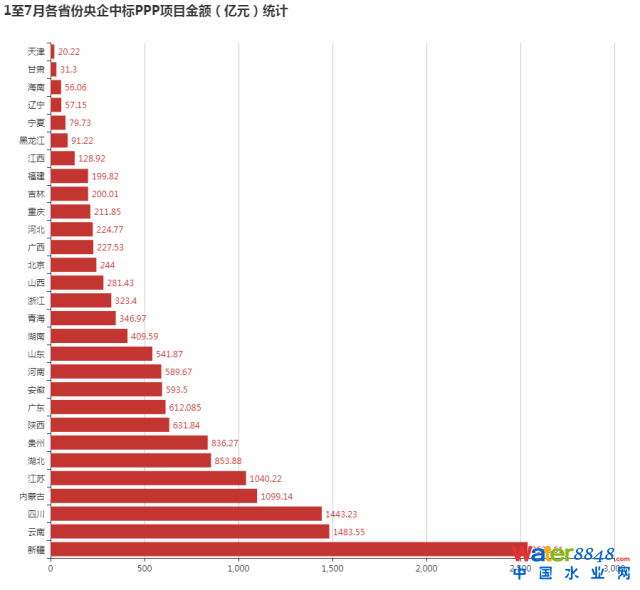 在新疆地區(qū)1-7月份,中國交建、中國建筑兩大巨頭分別以919億元、818億元占據(jù)有利市場,而中國交建則拿下708億新疆地區(qū)最大的PPP項(xiàng)目。