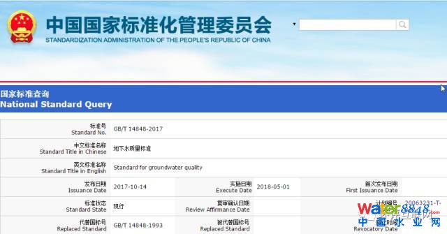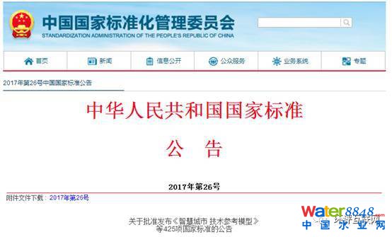 2017年10月14日國家標(biāo)準(zhǔn)化管理委員會第26號中國國家標(biāo)準(zhǔn)公告,批準(zhǔn)發(fā)布《智慧城市 技術(shù)參考模型》在內(nèi)的425項國家標(biāo)準(zhǔn)的公告, 《地下水質(zhì)量標(biāo)準(zhǔn)》 (GB/T 14848-2017)正式發(fā)布,將于2018年5月1日實施