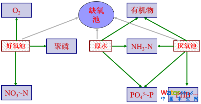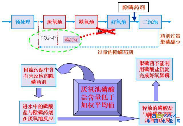 上述實(shí)驗(yàn)數(shù)據(jù)為我們推斷為什么化學(xué)協(xié)同除磷污水處理廠厭氧池不釋磷提供了一定的數(shù)據(jù)基礎(chǔ)。根據(jù)上述數(shù)據(jù),我們就能知道雖然我們是在二沉池投加的,但是到了好氧末端,磷酸鹽濃度相對是比較低的,此時除磷藥劑是過量的,那么過量的藥劑首先是與污泥發(fā)生絮凝沉淀反應(yīng),而后隨著回流污泥進(jìn)入到厭氧池中,這時候即使厭氧池有釋磷功能或現(xiàn)象,所釋放的磷酸鹽也要與除磷藥劑發(fā)生化學(xué)反應(yīng),生成磷酸鹽沉淀。也就是說化學(xué)協(xié)同除磷污水處理廠的厭氧池出來的混合液實(shí)際上是沒有磷酸鹽,或者低磷酸鹽的。而后這些混合液進(jìn)入到好氧池,就沒有辦法完成吸磷了,因?yàn)闆]有磷酸鹽可以吸了。那么既然不能吸磷了,后續(xù)自然也沒法釋磷了,因?yàn)獒屃资且葬屃姿a(chǎn)生PHB作為驅(qū)動力的。然后好氧池不吸磷,自然也沒有“聚磷”產(chǎn)生,自然后續(xù)也就沒法“釋磷”。也就是說厭氧釋磷與好氧吸磷是互相的,影響其一反應(yīng),必將影響到另一個反應(yīng)。