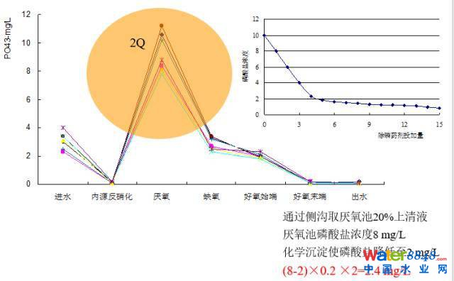 既然化學(xué)協(xié)同除磷已經(jīng)影響了我們生物除磷功能,那么似乎我們的厭氧/好氧模式也就會受到影響了,就需要考慮一定的應(yīng)對或補(bǔ)救措施。為此,我們對以前部分專家也提到過的厭氧池側(cè)流除磷進(jìn)行了一定的工程研究。大家都知道,我們沒有化學(xué)協(xié)同除磷的時候,很多污水處理廠厭氧池都有比較高的磷酸鹽濃度,基于這個濃度大概測算一下,如果把厭氧池20%到30%的混合液拿出來做化學(xué)除磷處理,這樣會去除2-5毫克升的磷酸鹽去除量,基于此提出一個化學(xué)除磷理念。
