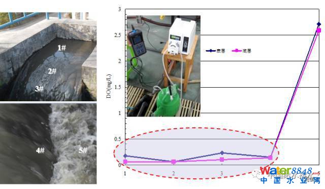 那么到底為什么跌水會形成這么高一個復(fù)氧水平,我們開始也咨詢了很多業(yè)內(nèi)專家,很多專家認(rèn)為不可能,有的專家認(rèn)為我們測試方法有問題,有的提出說我們的研究結(jié)論跟國際上的相關(guān)說法不太一致,為此也給我們提出了很多進(jìn)一步研究和驗(yàn)證的建議。為此,我們就選擇實(shí)際工程,進(jìn)行了相關(guān)的生產(chǎn)性測試。在南方某污水處理廠泵池出口的跌水區(qū)選擇了5個檢測點(diǎn),如圖中所示,其中4號和5號點(diǎn)分別位于跌水前和跌水后的區(qū)域。分別對5個點(diǎn)的表層水和深層水進(jìn)行了溶解氧的測試,結(jié)果表明,1~ 4號點(diǎn)表層和深層的溶解氧沒有明顯差別,證明表面復(fù)氧量相對較小。但是4號和5號之間出現(xiàn)明顯差別,也就是說跌水點(diǎn)前后出現(xiàn)明顯的溶解氧濃度差。