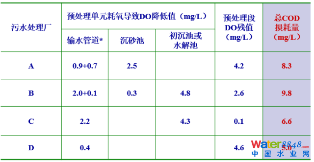 首先是預(yù)處理單元跌水復(fù)氧造成的碳源損耗問題,相關(guān)論文發(fā)表在2017年8月《中國給水排水》雜志上。這個現(xiàn)象也是我們偶然發(fā)現(xiàn)的,根據(jù)我們最初的理解,污水經(jīng)管網(wǎng)并由集水井出來后,應(yīng)該是厭氧狀態(tài)的,也就是比較低的溶解氧才對,結(jié)果調(diào)研測試的時候發(fā)現(xiàn)很多污水處理廠泵后水渠內(nèi)都有一定的溶解氧值,溯源后發(fā)現(xiàn)溶解氧主要來自于跌水點(diǎn)前后,跌水形成的復(fù)氧問題非常明顯,每一次跌水基本上能形成3到4 mg/L,甚至更高的溶解氧增量。據(jù)此推算,大部分污水處理廠預(yù)處理單元跌水可能就要消耗6~ 8 mg/L,甚至更高的可生物降解COD,而這些都是我們比較珍貴的碳源。因?yàn)檫@里面消耗的COD可能是我們最優(yōu)質(zhì)的碳源。