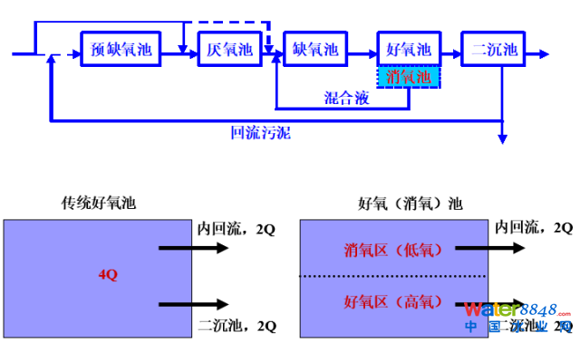 那么我們第二步就開始研究怎么樣能把這個回流混合液的溶解氧控制下來,或者說怎么讓流向二沉池的混合液和回流到缺氧池的混合液分開。我們團(tuán)隊就提出了一個在好氧池末端分割出消氧區(qū)的思路,該思路不同于傳統(tǒng)的增加池體,而只是在末端設(shè)置隔墻,將原有的4Q混合液分開成2個2Q混合液,實(shí)際停留時間不變,其中2Q混合液的消氧區(qū)中通過攪拌實(shí)現(xiàn)消氧,而2Q的好氧區(qū)繼續(xù)保持曝氣狀態(tài)。這也就相當(dāng)于是在不影響總體停留時間的情況下實(shí)現(xiàn)了回流混合液和二沉池混合液在功能上的有效分離,通過這個消氧區(qū)基本上可以將內(nèi)回流混合液對缺氧池反硝化脫氮的影響降低到最低水平,使整個缺氧池真正實(shí)現(xiàn)一個缺氧狀態(tài)。我們已經(jīng)利用這個思路對江蘇省部分污水處理廠進(jìn)行了運(yùn)行優(yōu)化,效果顯著。當(dāng)然我們最近設(shè)計的幾個污水處理廠也直接應(yīng)用了該技術(shù)。