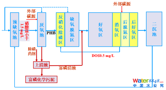 今天給大家講了這么多,那么我們怎么結(jié)合到一個工程中,或者結(jié)合到完整的工藝技術(shù)路線上,真正實(shí)現(xiàn)碳源節(jié)約和一碳多用。為此,我們也提出了生物處理單元的核心工藝技術(shù)路線。在這個路線中,我首先強(qiáng)調(diào)好氧池要設(shè)置一個消氧區(qū),解決回流混合液的溶解氧問題;然后缺氧池區(qū)分反硝化除磷區(qū)和反硝化脫氮區(qū);原水和外加碳源盡量進(jìn)入?yún)捬醭兀瑥?qiáng)化生物除磷效果,并將高磷酸鹽混合液進(jìn)行側(cè)流化學(xué)除磷,富磷化學(xué)污泥單獨(dú)處理,寡磷清液進(jìn)入好氧池處理;厭氧池的相對高濃度、高PHB含量污泥進(jìn)入反硝化除磷區(qū),進(jìn)一步強(qiáng)化反硝化除磷效果,這樣就最大限度的發(fā)揮了生物處理單元的功能,實(shí)現(xiàn)污水處理廠碳源的最大化利用。