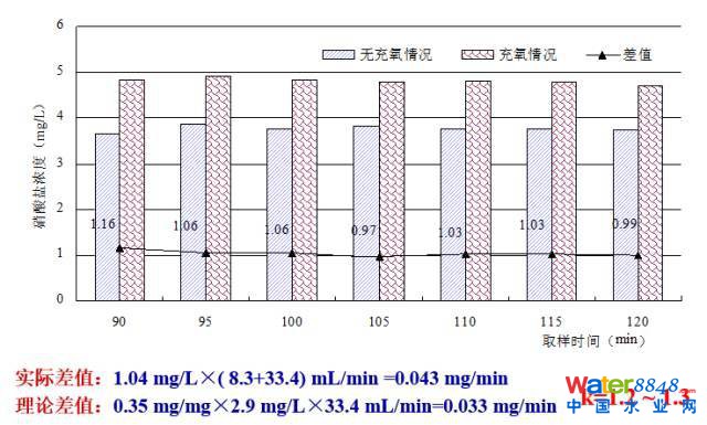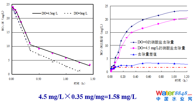 那么這個內(nèi)回流混合液到底對缺氧池,或者說對我們的脫氮量是什么影響,可否量化。我們也查閱了一些資料,發(fā)現(xiàn)當(dāng)時文獻(xiàn)表述不多,為此我們也希望能建立一個理論計算公式,首先大家都比較清楚,根據(jù)氧化還原反應(yīng)的電子關(guān)系理論計算結(jié)果,每1 mg的溶解氧會影響0.35mg的硝酸鹽氮去除量。那么我們首先進(jìn)行了一下靜態(tài)實(shí)驗(yàn),驗(yàn)證一下這個0.35是否成立,方法很簡單,就是兩個燒杯,一個有4.5 mg/L的溶解氧濃度,一個基本上沒有。攪拌并連續(xù)監(jiān)測硝酸鹽濃度,并繪制曲線計算兩個反應(yīng)器內(nèi)硝酸鹽去除量的差值。結(jié)果發(fā)現(xiàn)實(shí)驗(yàn)差值高于我們根據(jù)理論推導(dǎo)出的1.58 mg/L理論差值,表明還有其他因素影響,需要研究修正系數(shù)。