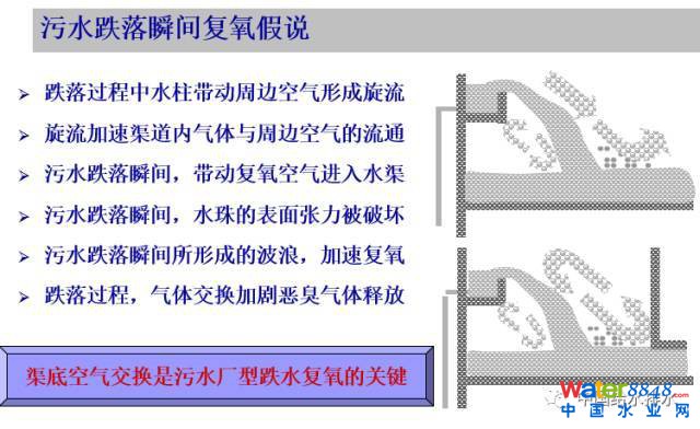 為了進(jìn)一步說明跌水復(fù)氧產(chǎn)生的原因,我們提出了一個污水跌落瞬間復(fù)氧的假說,并通過一定的測試手段進(jìn)行了驗(yàn)證。首先,受水的表面張力影響,污水跌落過程中的表面復(fù)氧現(xiàn)象并不明顯,但是跌落的過程會帶動周邊空氣運(yùn)動,并在半封閉的跌水池中形成旋流,通過這種旋流實(shí)現(xiàn)了跌水池內(nèi)氣體與外界大氣的溝通與置換,因此跌水池內(nèi)空氣中的氧含量并不低。另外,旋流的空氣會隨著跌水過程進(jìn)入到跌水池的污水里面,與此同時跌水形成的巨大沖擊力導(dǎo)致水珠的表面張力被破壞,使氧更容易與水混合。這可能是跌水復(fù)氧形成的最重要原因。