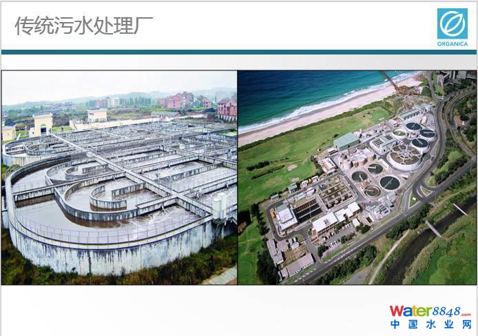 這張照片這是傳統(tǒng)的污水處理廠,我們可以看到非常不美觀的生化曝氣池,而且這些污水處理廠一般都建設(shè)在比較偏遠(yuǎn)地區(qū),需要配套建設(shè)很長管路、很多的泵站把污水收集起來,這些管道可能幾十公里甚至上百公里,需要耗費(fèi)大量的資金,我們的想法是將來的污水處理廠是不是要建到一百萬噸或者八十萬噸那么大,是不是可以小型化,分散化,建在工廠或者是學(xué)校里,或者是社區(qū)里并且與所在的環(huán)境完全融合。我會(huì)在后面提出一個(gè)FCR工藝的分布式污水處理站工藝和大家分享。
