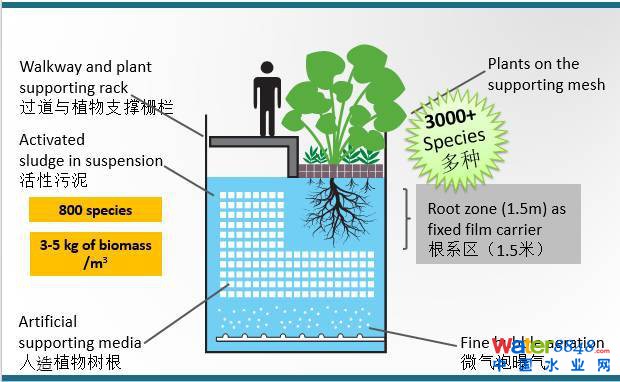 奧尼卡工藝的介紹,在傳統(tǒng)工藝方案的反應(yīng)池上加上植物支撐,過(guò)道,以及植物。植物的本身并不處理污水,我們是利用它的根系,根系就是一個(gè)載體的類型,生物膜法提供一個(gè)生物附著地方,因?yàn)橹参锔荡罅康谋缺砻娣e所以附著生物量非常大,FCR反應(yīng)池大概五米深左右,為了這個(gè)池的容積,植入人工載體,植物根系新陳代謝作用使這個(gè)池里面微生物種類從八百種上升到三千種,生物質(zhì)的總量也從3-5公斤上升到8-12公斤。