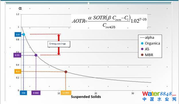 這是一個(gè)溶氧效率曲線,橫軸的TSS于縱軸溶氧效率α的關(guān)系圖,MBRTSS比較高,所以α值最低,FCRTSS最低,所以α最高,越高氧氣傳遞的利用就越高,需要的空氣就越少也就越節(jié)約能源,請(qǐng)看下面兩張圖片對(duì)于能量,占地面積的對(duì)比。