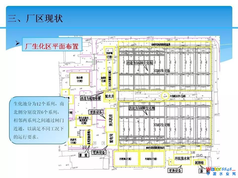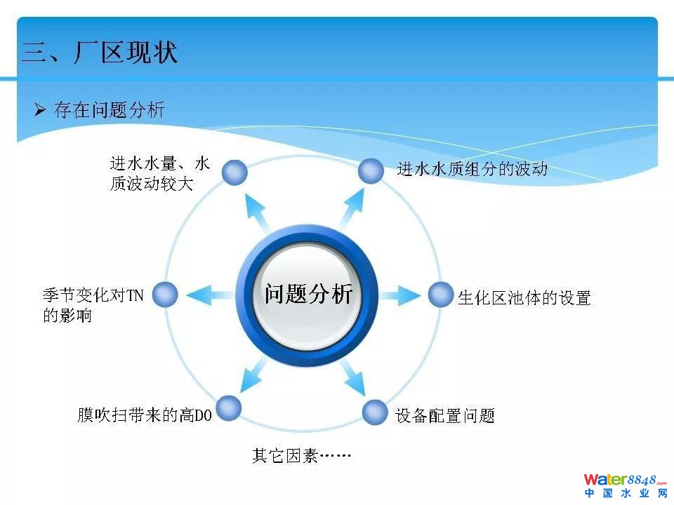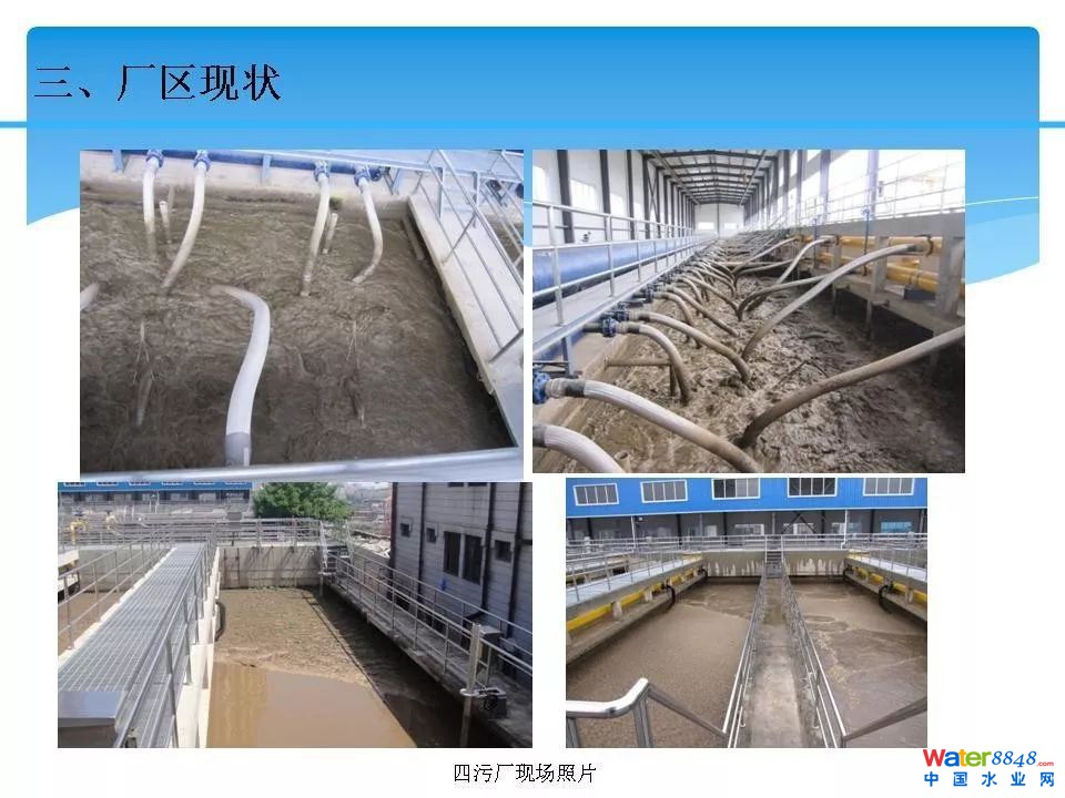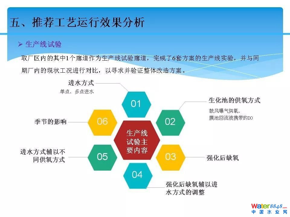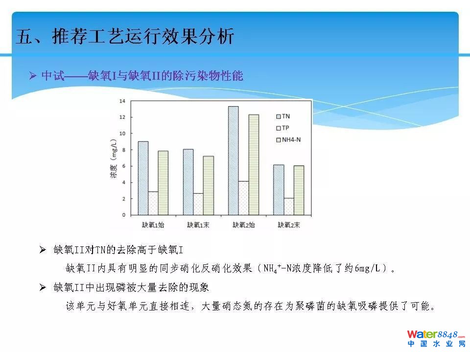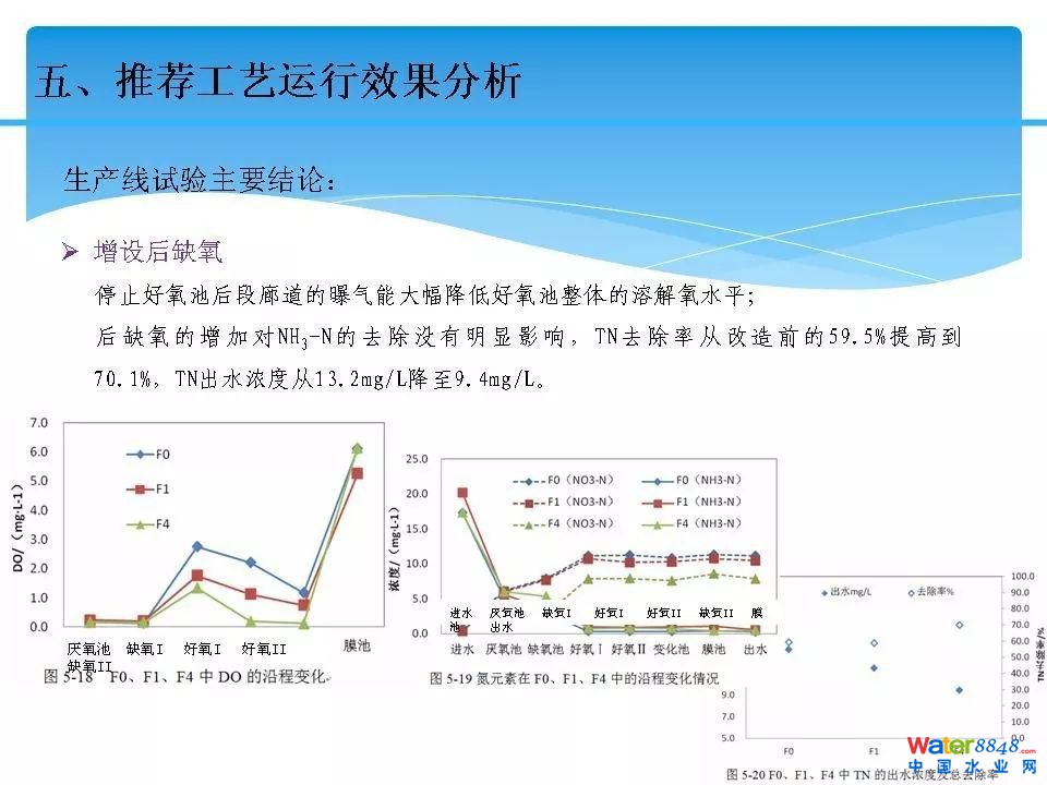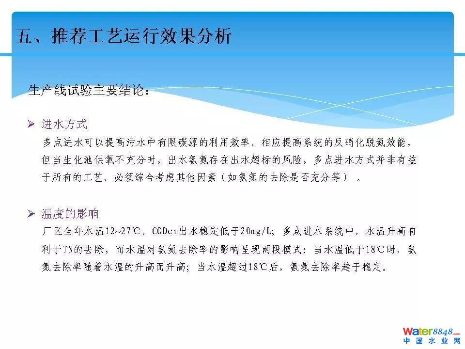 中試的基礎(chǔ)上,我們把它推廣到四廠一條生產(chǎn)線,做六套方案,包括進(jìn)水方式,供氧方式,強(qiáng)化后缺氧及輔助進(jìn)水方式的調(diào)整,進(jìn)水方式及供氧方式不同及季節(jié)變化等等做六套實(shí)驗(yàn)方案。這是實(shí)驗(yàn)的一個(gè)改造過(guò)程,實(shí)驗(yàn)的基本結(jié)論來(lái)看,我們?cè)谏a(chǎn)實(shí)驗(yàn)里面可以實(shí)現(xiàn)中試及理論計(jì)算同樣的結(jié)果。多點(diǎn)進(jìn)水的比例分配比較關(guān)鍵,后缺氧也不能分配太大水量。對(duì)于碳的去除溫度影響不大,對(duì)總氮,氨的降解18度是一個(gè)拐點(diǎn),18度以下溫度升高效率升高,18度以上溫度影響不是很大。