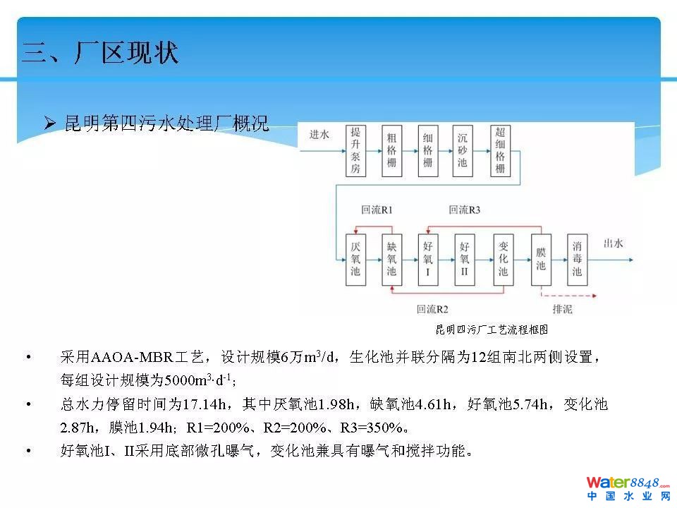 這個(gè)課題是從MBR工藝數(shù)學(xué)模擬,模型參數(shù)的實(shí)驗(yàn)及研究,到中試及生產(chǎn)性實(shí)驗(yàn),最后推廣應(yīng)用到兩個(gè)十萬(wàn)噸以上的實(shí)際工程這樣一個(gè)過(guò)程。首先針對(duì)的是昆明第四污水處理廠,原來(lái)也是一個(gè)SBR變形----ICEAS工藝,改成比較原始的MBR。2010年左右開(kāi)始運(yùn)行,我們2011年開(kāi)始進(jìn)入跟四廠一起研究。四廠是改造成MBR的A2O基本工藝,規(guī)模五萬(wàn)噸每天,這是實(shí)體改造。這一個(gè)邊上改成膜池和膜清洗。從效果看,由于當(dāng)時(shí)國(guó)內(nèi)對(duì)于整個(gè)MBR的認(rèn)識(shí)和設(shè)計(jì)經(jīng)驗(yàn)不是很充分,處理效率及能耗效率都不是特別高。