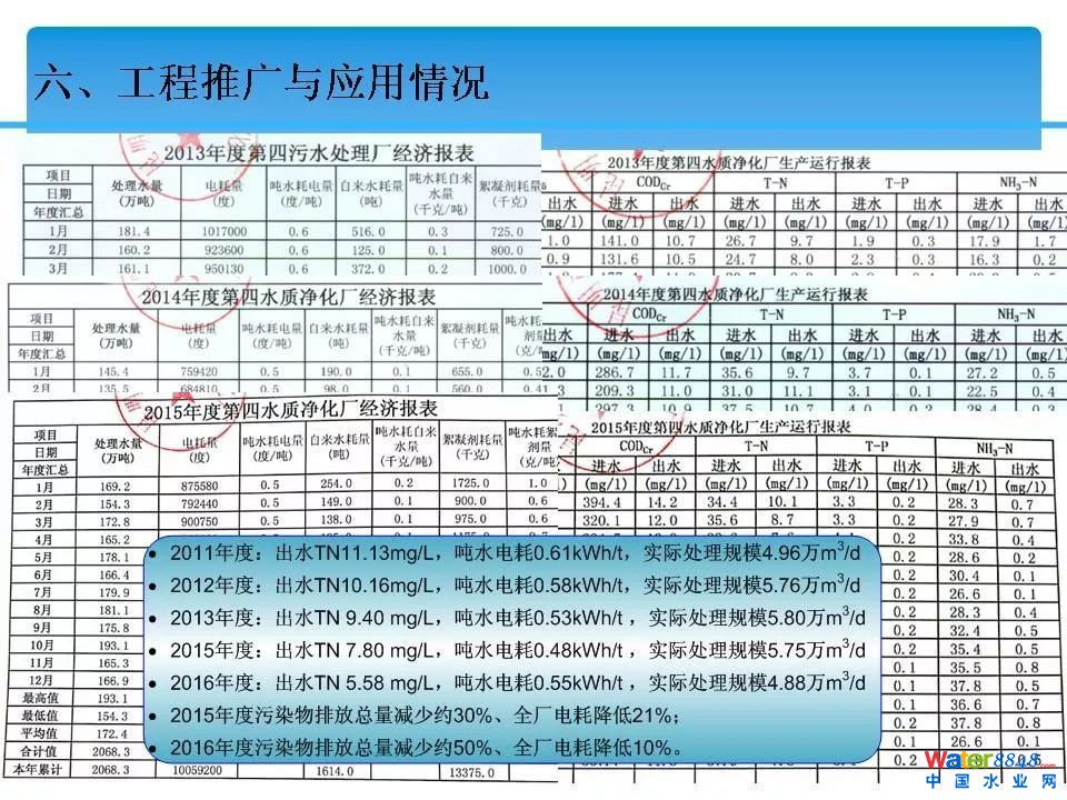 生產(chǎn)性實(shí)驗(yàn),這是2013,2014,2015年的數(shù)據(jù),我看中國(guó)給水排水雜志對(duì)這個(gè)有很好報(bào)道,經(jīng)各種技術(shù)改造后,耗電情況從2013,2014,2015年數(shù)據(jù)來(lái)看耗電量在下降。COD、總氮和總磷都是效果越來(lái)越好,出水COD基本都在10左右,總氮的話一開(kāi)始是在10左右,逐漸的在降低,到了2016年基本達(dá)到五點(diǎn)幾。總磷情況是更好一些。電耗也是逐漸下降。在生產(chǎn)性實(shí)驗(yàn)的基礎(chǔ)上,把這一研究成果推廣到大型污水處理廠設(shè)計(jì),昆明的第九廠,第十廠污水處理廠設(shè)計(jì)按照本研究的最優(yōu)流程和中試生產(chǎn)性實(shí)驗(yàn)驗(yàn)證的工藝路線及參數(shù)。
