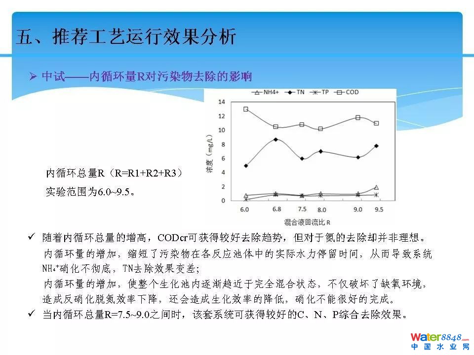 對(duì)回流比,我們希望利用膜池的氧。膜池最初這個(gè)回流比是很大的,最高達(dá)一比十幾,改進(jìn)過(guò)程中回流比由1:9,1:8,1:7這樣一步步的下降,膜池混合液大量回流到好氧池,其中的氧可以充分利用起來(lái)。整個(gè)回流情況來(lái)看不是越大越好。基本6到9這個(gè)區(qū)間,或者是再范圍小一點(diǎn),7.5到9這一個(gè)范圍對(duì)碳、氮、磷的綜合去除效果比較好。
