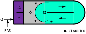 如前所述,卡魯塞爾氧化溝最明顯的特征是以立式低速表曝機取代水平軸表曝機,這樣做的工藝背景是使曝氣區(qū)基本接近完全混合反應(yīng)器的流態(tài),曝氣區(qū)下游的長渠道則基本接近推流反應(yīng)器模型的流態(tài)。因此卡魯塞爾氧化溝實際上是將兩種反應(yīng)器模型的優(yōu)勢結(jié)合在一起,既可利用長溝道進行較為徹底的生化反應(yīng),還能借助完全混合區(qū)的攪拌、緩沖能力化解水質(zhì)負荷的變化,具有較強的抗沖擊負荷能力。從現(xiàn)在的工藝觀點來看,這樣做帶來的另外一個好處就是在渠道下游形成的缺氧區(qū)還可以觸發(fā)反硝化反應(yīng)。如下圖所示。