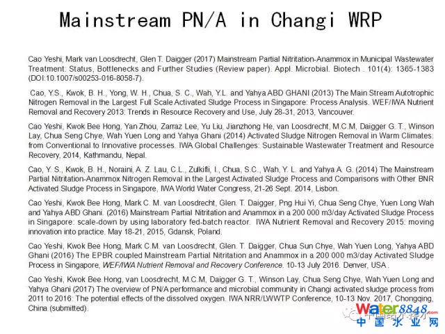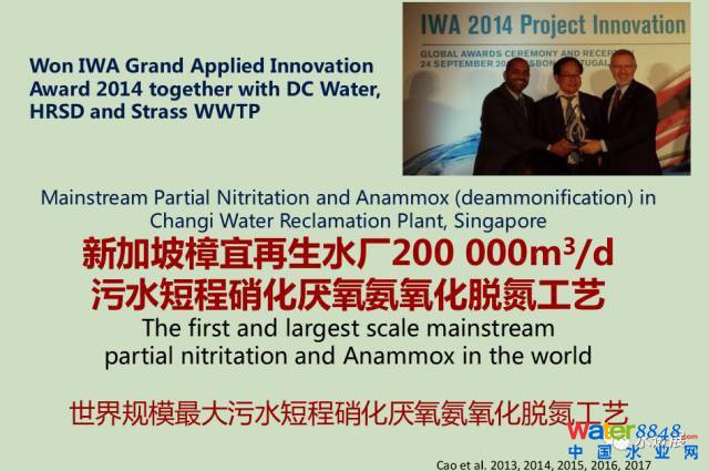 (詳見(jiàn)PPT)目前新加坡樟宜再生水廠,20萬(wàn)噸的主流厭氧消化過(guò)程已經(jīng)報(bào)告了,是世界上最大的部分短程氨氧化和氨厭氧化過(guò)程,并且在2014年,我們跟美國(guó)的兩家水務(wù)系統(tǒng)和Strass廢水處理一起贏得了國(guó)際水協(xié)的發(fā)明大獎(jiǎng)。