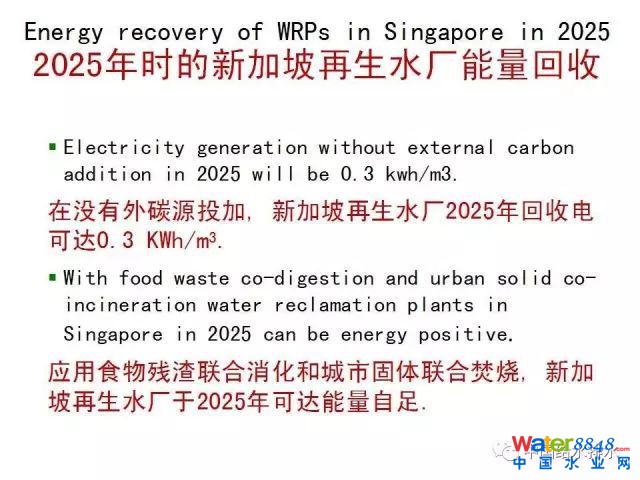 到2025年的時(shí)候,新加坡再生水廠的能源回收在沒(méi)有外加碳源的情況下可以達(dá)到0.3千瓦時(shí)每立方米污水。應(yīng)用食物殘?jiān)统鞘泄腆w廢棄物的協(xié)同焚燒,整個(gè)新加坡污水處理廠包括新生水廠可以達(dá)到能源自給,從而實(shí)現(xiàn)新加坡污水能源回收的第三版。