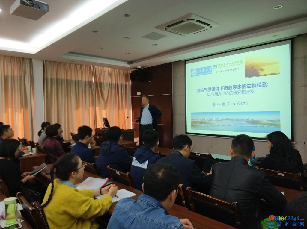 11月2日,應江南大學環(huán)境與土木工程學院邀請,原新加坡公用事業(yè)局首席專家,任國際水協(xié)會會員、國際水協(xié)營養(yǎng)化去除與回用專家組領導組成員、世界銀行環(huán)境專家和咨詢顧問曹業(yè)始博士來到環(huán)土學院開展學術交流活動。學術活動由環(huán)境工程專業(yè)責任教授李激教授主持,來自無錫排水行業(yè)骨干專家及學院60余名師生參加了此次學術報告會。