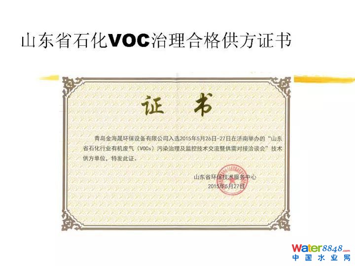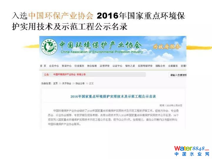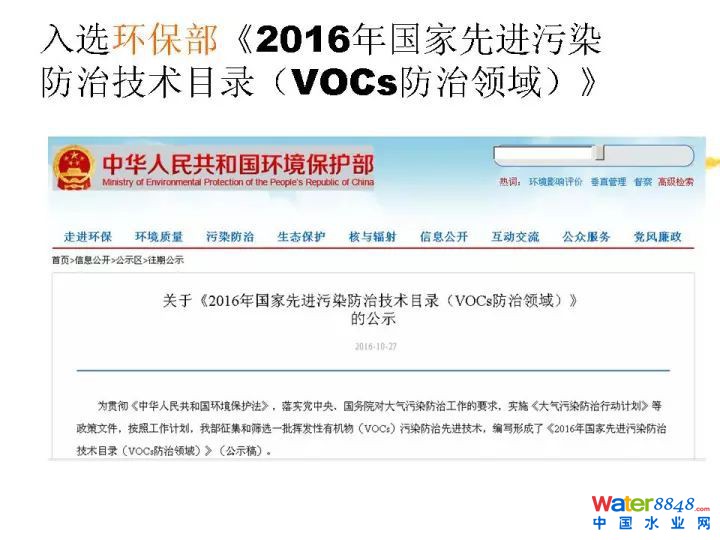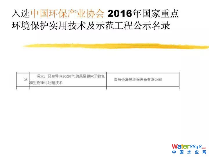 這是我們的通過9000,14000的認證,這是我們獲得中國環(huán)境保護產(chǎn)品的認證。非常榮幸跟大家通報一下,去年2016年的時候,我們國家環(huán)保部做了一個2016年的國家先進污染防治技術目錄。霧霾天越來越重,環(huán)保部非常著急征集治理技術,我們技術很榮幸入選了環(huán)保部的先進污染防治技術目錄。這里大家可以看到,就是污水污泥處置過程當中惡臭異味廢氣處理技術。同時入選中國環(huán)保產(chǎn)業(yè)協(xié)會2016年的國家重點環(huán)境保護實用技術及示范工程的目錄。這也是我們獲得的一點點的認可。這是污水處理廠惡臭異味的凈化技術。我下面還會詳細介紹。這些都是我們的獲得榮譽,不多講了。