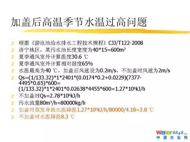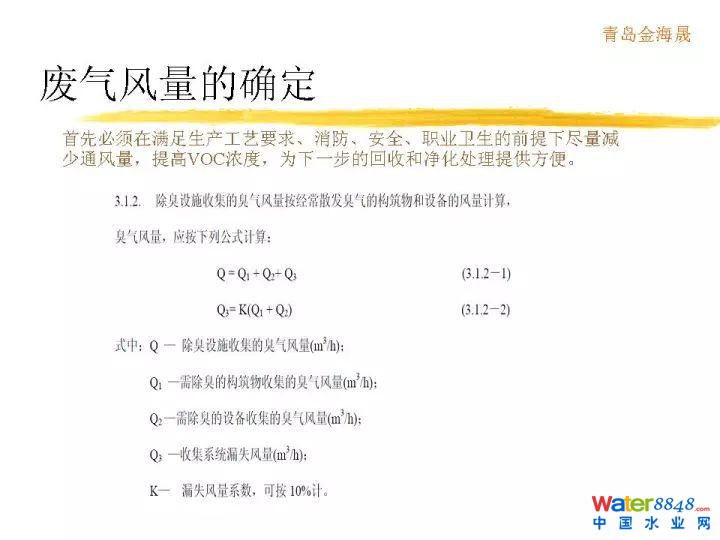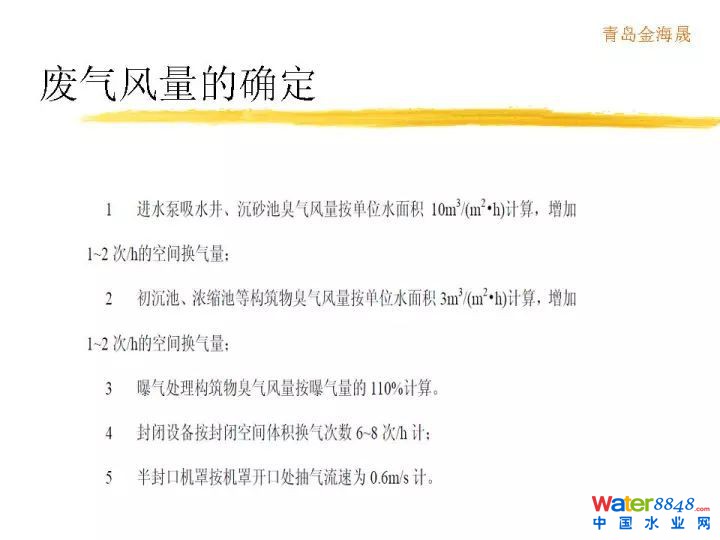 廢氣風量的確定,首先是滿足生產(chǎn)工藝要求,消防,安全,職業(yè),衛(wèi)生都得到滿足前提下,然后我們盡量減少通風量,提高廢氣濃度。為下一步回收還有凈化來提供方便。做完以后廢氣量怎么確定?各個不同的池子,不是采用完全一樣的通風量,基本按照水面面積來核算。我們知道所有的廢氣都是在水面上揮發(fā),沒有水面就沒有揮發(fā)。所以這個進水泵房,吸水井,沉砂池每小時每平方米水面10立方廢氣量。污水管道到這個地方一跌水,昨天孫主任講一跌水會復氧。實際上一跌水除了復氧還會什么后果?就是里面溶解的臭氣會揮發(fā)出來。這個臭氣濃度非常高。前面一段選取比較大的通風量。后續(xù)一平方米1小時3立方足夠了,還包括其他的。比如格柵機,污泥脫水機盡量外面加通風罩密閉起來,密閉空間一小時8次換氣次數(shù)用的比較多的。