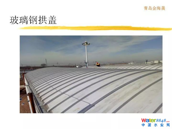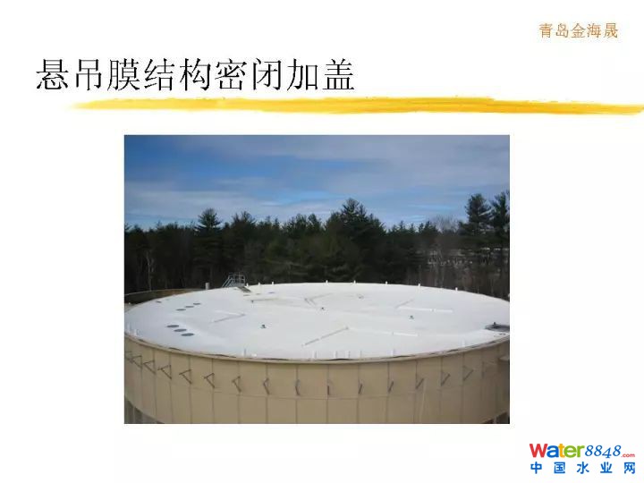 重點講一講我們?nèi)〉玫膶@膽业跄,很平的把一個池子蓋起來了,這樣它的最大的好處就是膜的這一個面積達到最小化,膜密閉空間也最小化。這對氣體收集最好的。氣量得到非常大的減小。這是它的最大的優(yōu)點。這是實際工程照片。這是圓形池照片。人站上面都沒有問題,膜看似顫悠悠,實際強度非常高。人上來走之后不像走在一個剛性屋面那么穩(wěn),這個膜有一點彈性。強度沒有問題。