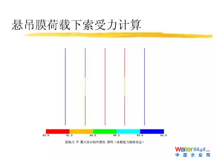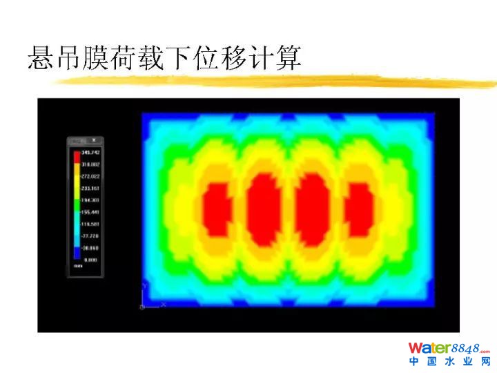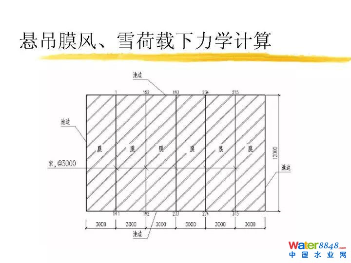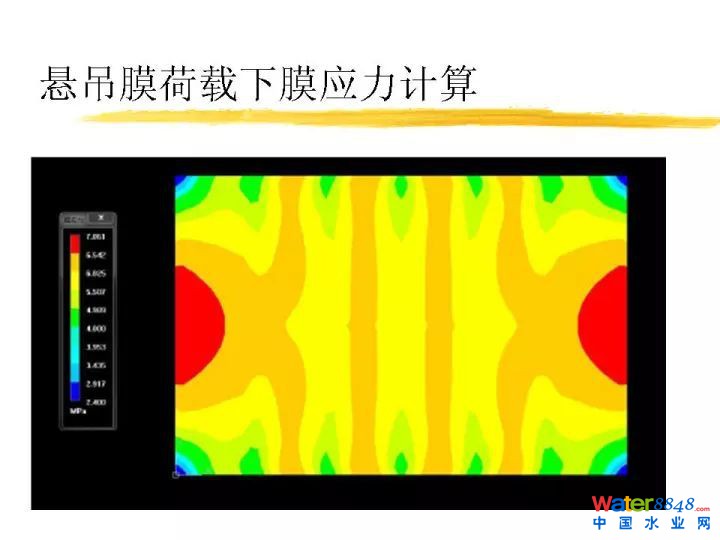 作為懸吊膜大家可能經(jīng)常關注這么幾個問題,第一個下雨怎么辦,非常簡單,開有落水口。我們封一個污水池子,這是懸吊膜荷載下膜應力計算。這個應力多大小,相當于膜許用應力的1/10。這個保險系數(shù)達到十倍,非常安全。這是懸吊膜荷載下索受力計算,也非常安全。再一個如果下雪了雪堆上面怎么樣呢?這也是一個問題。我們針對這個做了很多測定。這個膜導熱系數(shù)大約0.14瓦每米每K。常用膜厚度1毫米。溫差設定為10度。冬季很冷時水溫也會低于10度。假設溫差10度,一平方米的膜變傳熱1400瓦,相當一平方米加1400瓦的電熱器。雪一旦落上去很快熔化變成水排放掉了。不用擔心這個雪荷載的問題。這個雪融化速度多少?一平方米一小時可以融化15公斤雪。即使一下子積四十公斤雪在上面要兩個多小時化完,雪下完基本融化完了,不用擔心它的問題。沒有計算之前常識感覺不可能會積多少雪,實際這個膜結(jié)構(gòu)跟普通做建筑膜結(jié)構(gòu)不一樣。比如做車棚里面外面可能溫度一樣,比如體育場體育看臺雪積上面,會帶來較大的雪荷載,我們蓋污水池上面,污水池里面溫度跟污水一樣溫度,有十度的傳熱溫差,相當于每個平方米上面拿1400瓦的熱不斷烘著它,雪立刻化掉。