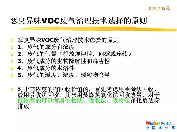 這個惡臭異味VOC怎么處理呢?有掩蔽法、擴散法,這些方法用的少;瘜W吸收法,吸附法,生物處理法,低溫等離子,化學燃燒等等使用較多。大致說這些廢氣怎么解決呢?我們也有好多的方法。這個大略可以選一個處理方法。廢氣濃度高,氣量不是很大,這時候可以采用冷凝辦法回收。可以采取洗滌,焚燒辦法。采用低溫濃縮辦法,吸附辦法等等。最重要的就是我們畢竟搞環(huán)保的,對于生物法都最為拿手,所以我們就想既然是廢氣里面這些有機物跟污水里面有機物都有相同之處,可以用微生物把他們干掉。對一些低濃度,大風量的這樣一些廢氣最合適用微生物辦法解決。就是生物法。
