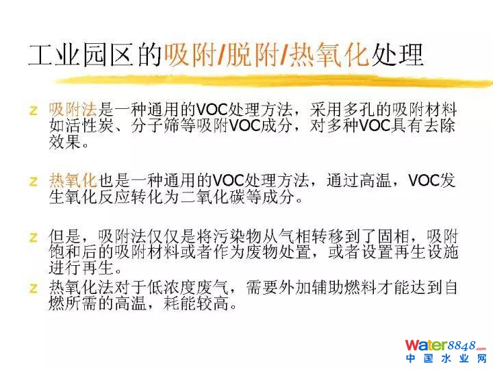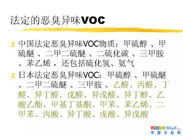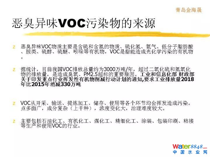 我想講的主要內(nèi)容一個惡臭異味VOC的來源和強度,再一個就是處理的技術,剛才創(chuàng)業(yè)環(huán)保同行提出了全流程技術。我們認為如果這個氣體已經(jīng)揮發(fā)出來,就必須密閉進行收集處理。收集完要輸送,之后進行處理。惡臭異味成分基本含硫含氮,城市污水里面主要包含蛋白質(zhì),氨基酸等含氮,含硫這樣的物質(zhì)經(jīng)過厭氧,產(chǎn)生硫化氫、氨氣、低分子脂肪酸等等異味廢氣。VOC目前排放量非常大,都會帶來氣味。帶來霧霾,還有臭氧超標很重要的問題。這些帶有異味的揮發(fā)的VOC,揮發(fā)性的有機物都是必須要進行嚴加處理的。中國法定惡臭異味VOC有如下這些。