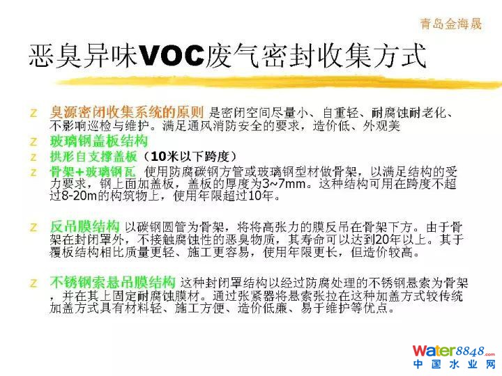 惡臭異味VOC廢氣密封收集方式有以下。臭源密閉收集系統(tǒng)的原則。加蓋方式包括玻璃鋼蓋板結(jié)構(gòu)、拱形自支撐蓋板、骨架+玻璃鋼瓦、反吊膜加蓋結(jié)構(gòu)、不銹鋼索懸掛膜結(jié)構(gòu)。
