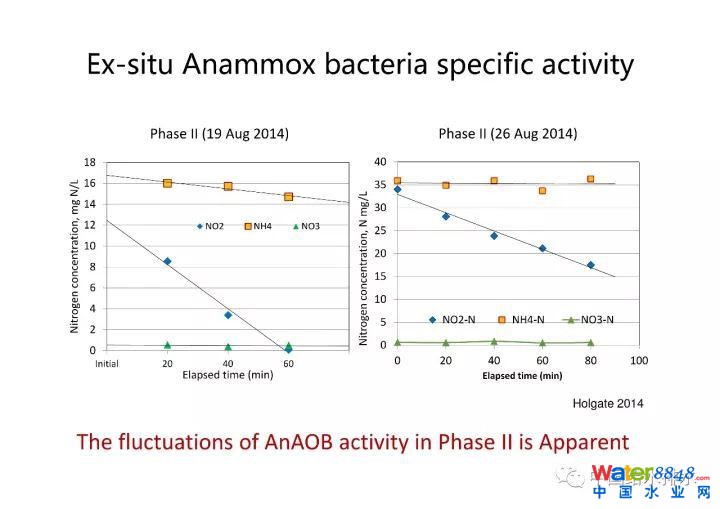 今天污水處理的根本難題是碳管理。在傳統(tǒng)的生物處理過(guò)程中,原水當(dāng)中的碳服務(wù)于兩個(gè)目的,一個(gè)營(yíng)養(yǎng)物去除,第二個(gè)送到硝化池里面產(chǎn)生沼氣。營(yíng)養(yǎng)物標(biāo)準(zhǔn)嚴(yán)格時(shí)實(shí)際沒有多少碳源可以用作能源回收的。因此,發(fā)展一種營(yíng)養(yǎng)去除不需要碳源的新過(guò)程,就提到議事日程上。氨氮厭氧氧化菌發(fā)現(xiàn)以后,引起了人們的注意。因?yàn)樗梢怨?jié)約60%的溶解氧,且不需要碳源進(jìn)行氨氮去除。這是一個(gè)根本性的變化。就是今天上午彭老師講,碳跟氮去除不用放在一起,可以分開來(lái)處理。理論上來(lái)說(shuō)厭氧氧化全部成功可以把所有碳源拿去做能源回收。美國(guó)的切薩皮克Chesapeake.) 地區(qū)有很嚴(yán)格排放標(biāo)準(zhǔn)。BluePlains污水處理廠每年花六百萬(wàn)美元買碳源。這是美國(guó)開發(fā)這項(xiàng)技術(shù)的主要驅(qū)動(dòng)力。歐洲的驅(qū)動(dòng)力是增加能源回收。從國(guó)外研發(fā)來(lái)看,已經(jīng)花費(fèi)六年時(shí)間進(jìn)行改技術(shù)的開發(fā)。而對(duì)國(guó)內(nèi)來(lái)說(shuō),我們相當(dāng)部分的污水碳氮比比較低,如果能夠應(yīng)用這項(xiàng)技術(shù),可以在低碳氮比情況下達(dá)到高標(biāo)準(zhǔn)的營(yíng)養(yǎng)去除。樟宜回用水廠實(shí)行了主流氨氮厭氧化(60萬(wàn)噸每天),工藝是典型的五點(diǎn)進(jìn)料,進(jìn)料以20%的比例進(jìn)每一個(gè)硝化池。回流比(50%)進(jìn)入到第一個(gè)硝化池。硝化池和好氧池容積相同。整個(gè)水力停留時(shí)間為5.6 h。新加坡污水溫度為28 ℃-32℃。 這個(gè)圖是我們從2011年在現(xiàn)場(chǎng)取樣分析的平均值制成。有兩個(gè)典型現(xiàn)象:第一,氨氮不但好氧池里面去除,在厭氧池里也被去除;第二,每個(gè)好氧池的末端的亞硝酸氮濃度遠(yuǎn)遠(yuǎn)高于硝酸氮濃度。短程硝化很明顯。部分硝化率為72%,相當(dāng)于10個(gè)氨氮進(jìn)入好氧去,有7個(gè)氨氮被氧化掉。而這7個(gè)被氧化掉的氨氮中70% 氧化成了亞硝酸,剩余的變成了硝酸根。亞硝酸氧化菌的活性被嚴(yán)重抑制。