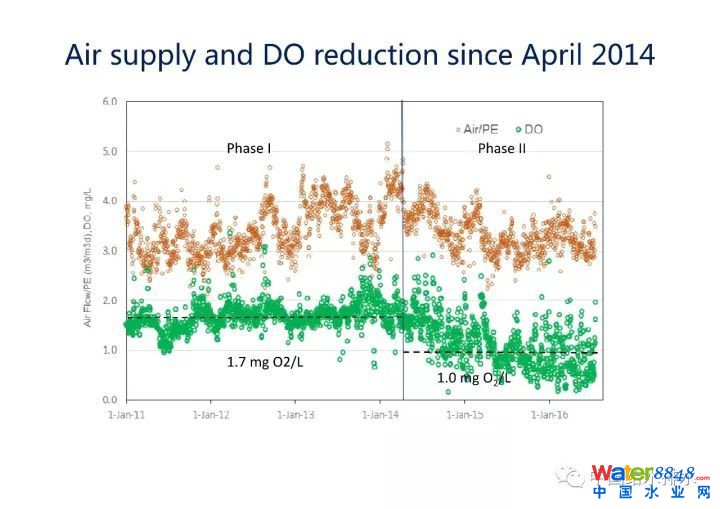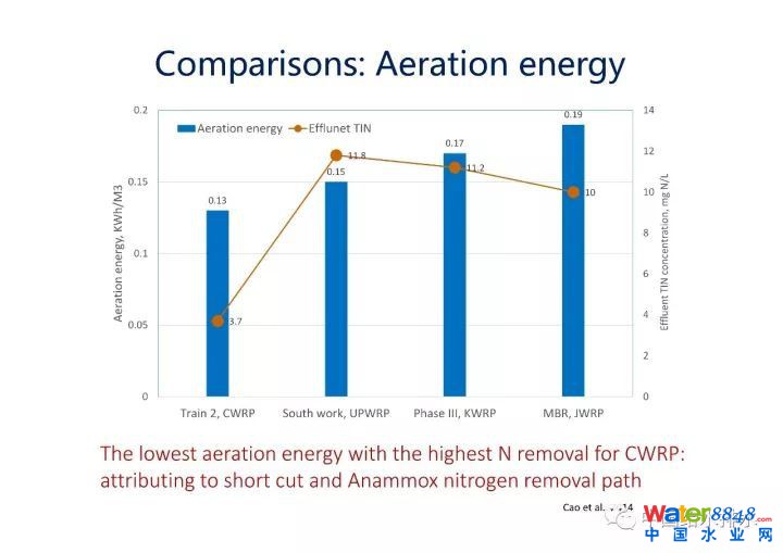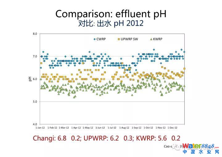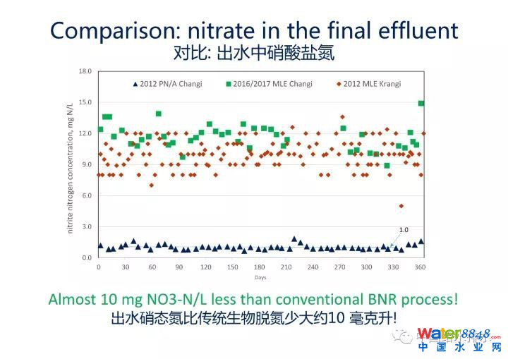 對(duì)比曝氣能耗,樟宜處理每立方水電耗為0.13 kW·h,能耗比新加坡其它幾個(gè)污水廠低10%-30%。 而樟宜污水廠的出水TN遠(yuǎn)低于新加坡其它幾個(gè)污水廠,這充分說(shuō)明樟宜污水廠的脫氮能耗最低。我在這里沒有談脫磷,我們也在厭氧區(qū)發(fā)現(xiàn)反硝化脫磷現(xiàn)象,今天時(shí)間有限就不講了。