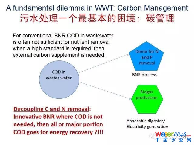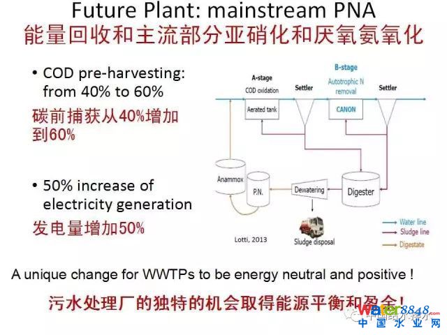到2025年新加坡三個(gè)水廠建成的時(shí)候,能量回收的情況如何呢?污水處理最大的困境就是碳的管理,本身讓碳源要用來(lái)去除營(yíng)養(yǎng)物又產(chǎn)能源的時(shí)候,是很難兩全其美的,這就是我們現(xiàn)在要談主流厭氧氨氧化的問題。未來(lái)處理廠的概念,如果這概念廠能實(shí)現(xiàn),今后的處理廠可可以把盡量多的碳拿下來(lái)送到厭氧消化里面去產(chǎn)生能源。但是條件是什么呢?后面的營(yíng)養(yǎng)物的去除不需要碳源,或者是需要的很少,這就提供了一種能源平衡和剩余的可能性。比如說(shuō)我們先的現(xiàn)在的初沉池碳去除是40%,你就可以增長(zhǎng)到60%,相當(dāng)于50%能源的增加。