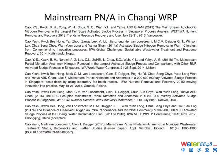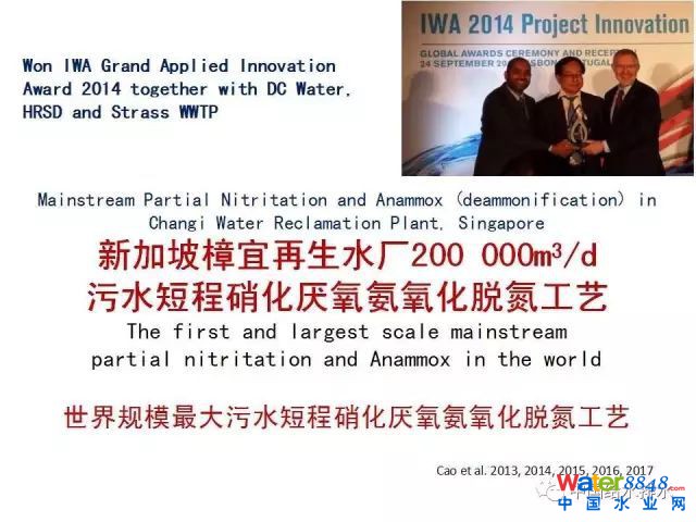 (詳見PPT)目前新加坡樟宜再生水廠,20萬(wàn)噸的主流厭氧消化過(guò)程已經(jīng)報(bào)告了,是世界上最大的部分短程氨氧化和氨厭氧化過(guò)程,并且在2014年,我們跟美國(guó)的兩家水務(wù)系統(tǒng)和Strass廢水處理一起贏得了國(guó)際水協(xié)的發(fā)明大獎(jiǎng)。