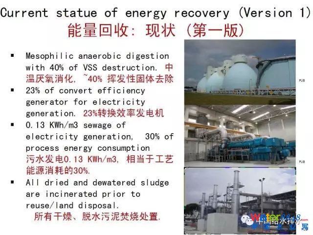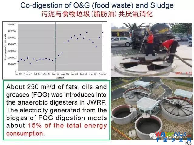 如果抓住這幾個(gè)環(huán)節(jié)以后,就可以有相當(dāng)?shù)碾娔艿幕厥眨次覀兎Q之為能源回收的第一版。目前,在新加坡所有的污泥都進(jìn)行中溫的厭氧消化,固體揮發(fā)物的去除率是大約40%,達(dá)到國(guó)際上的公認(rèn)的水平。