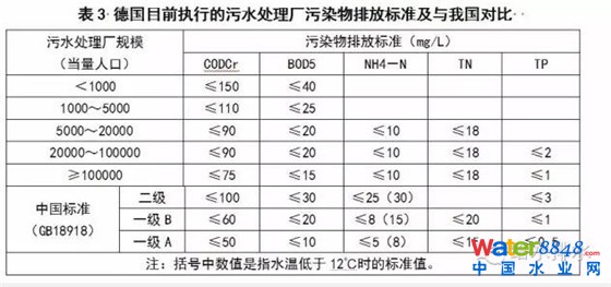 從90年代初開始,德國污水處理廠要求進行除磷和除氮,1991年德國當時的“Abwassertechnisch enVereinigung e.V”(ATV——污水技術協(xié)會)發(fā)布了《ArbeitsblattA131—Bemessung von einstufigen Belebungsanlangen ab 500 Einwohnerwerten》(5000當量人口以上一段活性污泥法計算規(guī)程——A131)拉開了德國污水處理廠除磷、除氮的序幕。從圖2可以看出,德國污水處理廠出水污染物濃度自90年代急劇現(xiàn)將,表明除磷除氮改造取得了明顯成效。近年來,德國污水處理廠出水COD、NH4—N、TN和TP值分別穩(wěn)定在28、1.6、9、0.7mg/L左右。除總磷外,其余主要指標均優(yōu)于我國《城鎮(zhèn)污水處理廠污染物排放標準》出水一級A標準,詳見表3。
