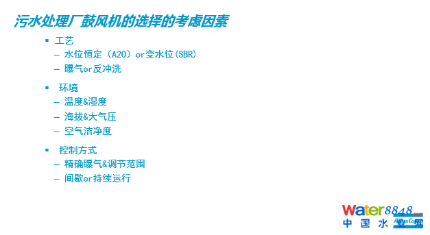 前面在介紹風(fēng)機(jī)類型時(shí),已經(jīng)提到一個(gè)概念,沒(méi)有最好的風(fēng)機(jī),只有最合適的風(fēng)機(jī)。選擇風(fēng)機(jī)時(shí)需要考慮哪些方面?總結(jié)以下幾條,從工藝來(lái)講水量是否恒定,有一些水位是會(huì)持續(xù)變化的。從應(yīng)用來(lái)看,風(fēng)機(jī)是用來(lái)曝氣還是反沖洗。因?yàn)閷?duì)于一些反沖洗的工藝,客戶的用氣需求是間歇性的,例如沙濾池反沖洗,要求每3-6小時(shí)一次,每次3-10分鐘。這就要求鼓風(fēng)機(jī)頻繁啟停,這在設(shè)備選型時(shí)就要考慮。從環(huán)境維度來(lái)講,離心風(fēng)機(jī)是動(dòng)力式風(fēng)機(jī),空氣密度影響非常大。從控制方式,包括我們現(xiàn)在提倡一些精確曝氣。大家選擇風(fēng)機(jī)需要多方面綜合考慮。