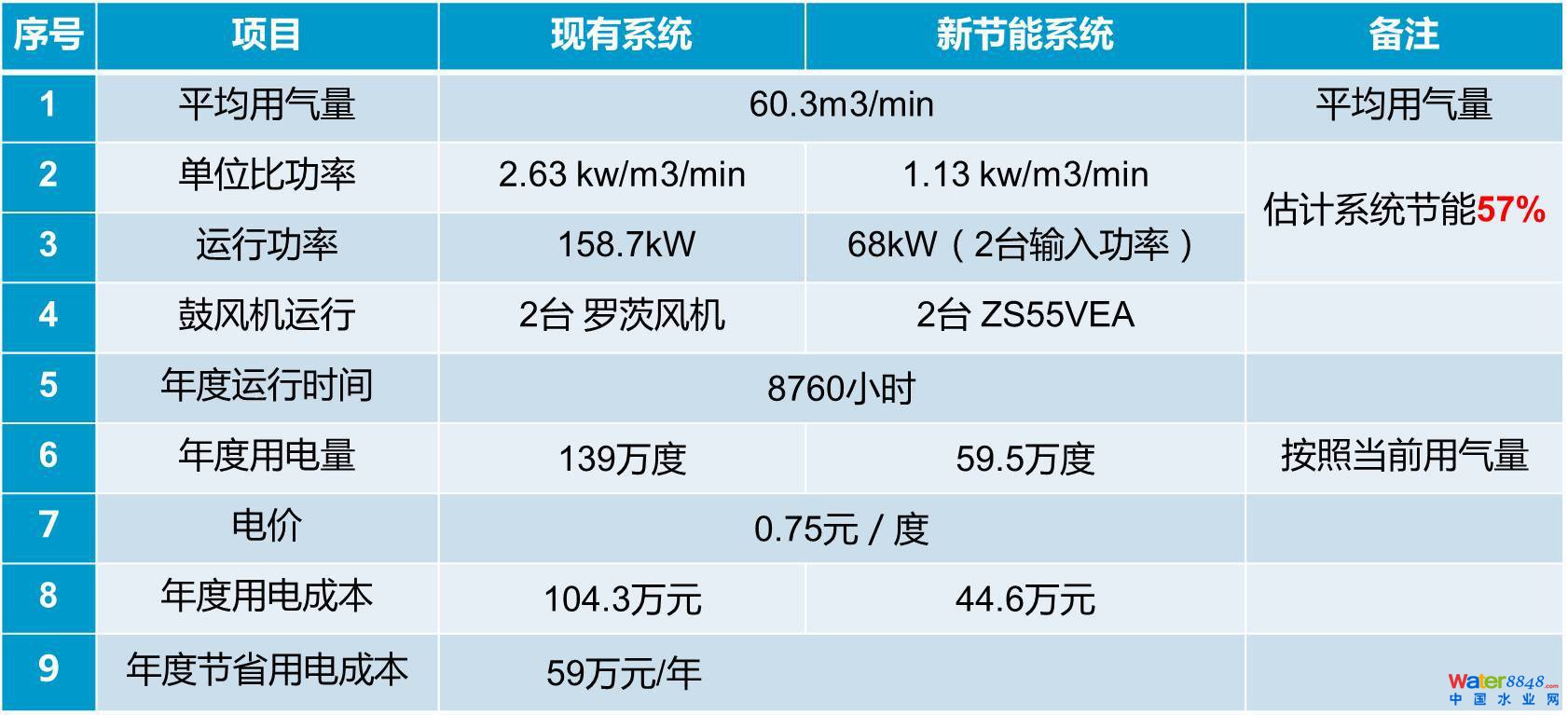 以下結(jié)合一個(gè)具體的案例分析螺桿鼓風(fēng)機(jī)較羅茨風(fēng)機(jī)的節(jié)能效果。
