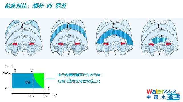 下面兩張圖分別展示了羅茨鼓風(fēng)機(jī)和螺桿鼓風(fēng)機(jī)的壓縮過(guò)程。顯而易見(jiàn),圖中綠色部分是螺桿鼓風(fēng)機(jī)產(chǎn)生節(jié)約的能源。