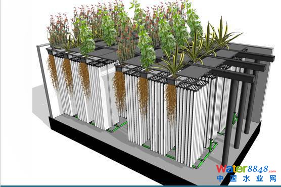 與其他基于活性污泥法的方案相比,使用自然(植物)和人工(專利的生物纖維)根須結(jié)構(gòu)作為生物膜載體,能夠在每立方米的反應(yīng)器體積內(nèi)培養(yǎng)和維持三至四倍于活性污泥法的生物濃度。在系統(tǒng)中,反應(yīng)器中的生物大部分是附著生長而不是懸浮的。因此需使用“等效生物濃度”(EBC)而不采用混合液懸浮固體濃度(MLSS)來描述生物質(zhì)濃度。系統(tǒng)的等效生物濃度換算下來高達(dá)15~18kg/m3。相比之下,遠(yuǎn)高于一般活性污泥法的混合液懸浮固體濃3~5kg/m3。與典型的生物接觸氧化法相比,食物鏈反應(yīng)器中的生物數(shù)量更多表面積更大,其表面積與體積比高達(dá)12000m2/m3,使得反應(yīng)器體積內(nèi)的活性污泥高達(dá)15~18kg/m3。結(jié)果是其所需的水力停留時間(HRT)比典型的生物接觸氧化更短。與活性污泥法相比,食物鏈反應(yīng)器,在移除相同量的污染物/營養(yǎng)物質(zhì)所需的反應(yīng)器體積是活性污泥法的一半(或更。,節(jié)約用地效果明顯。FCR食物鏈反應(yīng)器植物與填料結(jié)合示意圖見下圖。