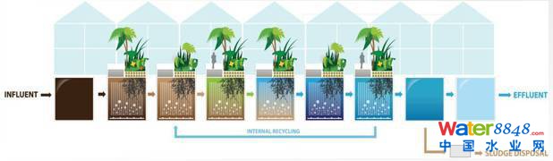 奧尼卡工藝的介紹,在傳統(tǒng)工藝方案的反應(yīng)池上加上植物支撐,過道,以及植物。植物的本身并不處理污水,我們是利用它的根系,根系就是一個載體的類型,生物膜法提供一個生物附著地方,因?yàn)橹参锔荡罅康谋缺砻娣e所以附著生物量非常大,FCR反應(yīng)池大概五米深左右,為了這個池的容積,植入人工載體,植物根系新陳代謝作用使這個池里面微生物種類從八百種上升到三千種,生物質(zhì)的總量也從3-5公斤上升到8-12公斤。